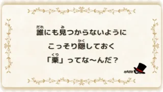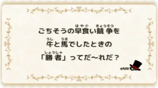 ラクダとカメとサイが買った「商品」ってな~んだ? ふつう(中学生) X Facebook はてブ LINE コピー 2025.11.022025.11.03 [ ふつう(中学生)- 挑戦状 018 ]ヒントをみるおたすけロボ言葉(ことば)をつなげると出(で)てくる「商品(しょうひん)」のことダヨ!答(こた)えをみるなぞなぞ仮面正解(せいかい)は「カメラ」だぞ!わかったかな!?イラっと博士“カメ・ラクダ・サイ”じゃな!おにまるクンつぎの挑戦状(ちょうせんじょう)は一番下(いちばんした)から進(すす)めるオニ!