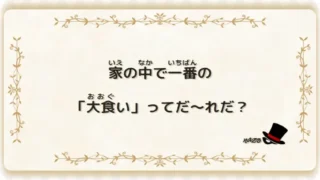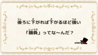 曲がり角で思いがけず出会う「虫」ってな~んだ? | ふつう(中学生レベル)- 挑戦状 062 ふつう(中学生) X Facebook はてブ LINE コピー 2025.11.042025.11.05 ヒントをみる おたすけロボ “思(おも)いがけず出会(であ)うこと”を別(べつ)の言(い)い方(かた)にした「虫(むし)」のことダヨ! 答(こた)えをみる なぞなぞ仮面 正解(せいかい)は「蜂(はち)」だぞ!わかったかな!? イラっと博士 蜂(はち)(鉢(はち))合(あ)わせのことじゃな! おにまるクン つぎの挑戦状(ちょうせんじょう)は一番下(いちばんした)から進(すす)めるオニ!