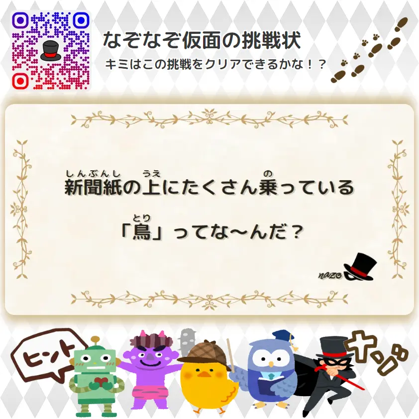 新聞紙の上にたくさん乗っている「鳥」ってな~んだ? | ふつう(中学生レベル)- 挑戦状 075 ふつう(中学生) X Facebook はてブ LINE コピー 2025.11.042025.11.05 ヒントをみる おたすけロボ 書(か)かれている内容(ないよう)のことを言(い)う「鳥(とり)」のことダヨ! 答(こた)えをみる なぞなぞ仮面 正解(せいかい)は「キジ」だぞ!わかったかな!? イラっと博士 キジ(記事(きじ))のことじゃな! おにまるクン つぎの挑戦状(ちょうせんじょう)はこれだオニ! 次の挑戦状古い容器を発掘したときの「気持ち」ってど~んなだ?ふつう(中学生レベル)- 挑戦状 076
