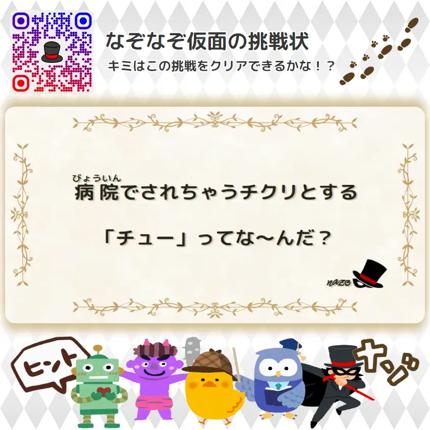 病院でされちゃうチクリとする「チュー」ってな~んだ? | やさしい(幼稚園レベル)- 挑戦状 078 やさしい(幼稚園) X Facebook はてブ LINE コピー 2025.11.082025.11.09 ピヨピヨ探偵やさしい(幼稚園(ようちえん)レベル)の挑戦状(ちょうせんじょう)だピ! ヒントをみるおたすけロボ痛(いた)くてみんなが好(す)きじゃない「チュー」のことだヨ! 答(こた)えをみるなぞなぞ仮面正解(せいかい)は「注射(ちゅうしゃ)」だゾ!わかったかな!?イラっと博士注射(ちゅうしゃ)(チューしゃ)のことじゃな! ピヨピヨ探偵次(つぎ)の挑戦状(ちょうせんじょう)はこれだピ!