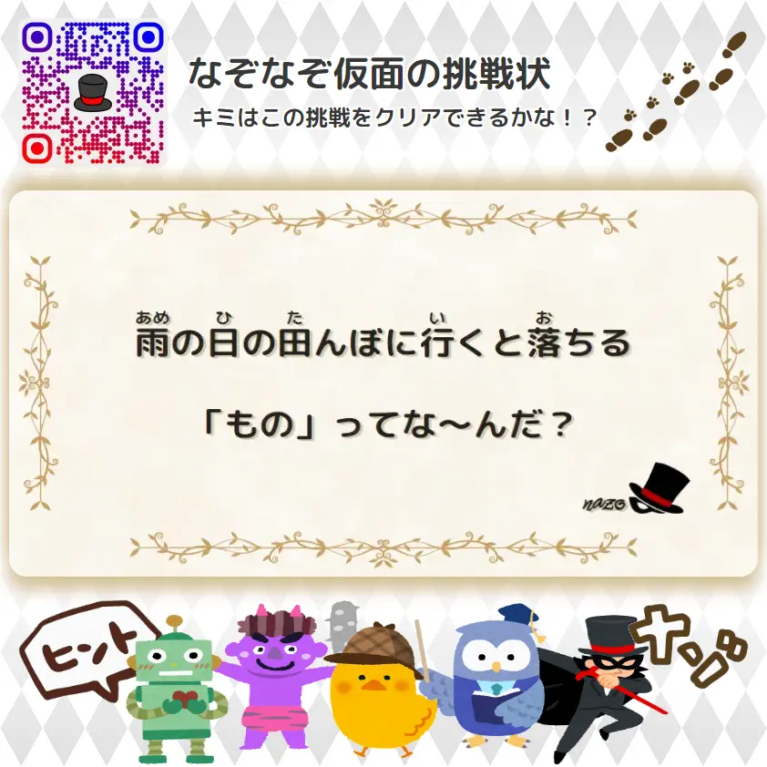 拳銃を半分に折って作られた「楽器」ってな~んだ? | むずかしい(大人レベル)- 挑戦状 078 むずかしい(大人) X Facebook はてブ LINE コピー 2025.11.082025.11.09 なぞなぞ仮面むずかしい(大人(おとな)レベル)の挑戦状(ちょうせんじょう)だゾ! ヒントをみるおたすけロボ“折(お)った拳銃(けんじゅう)”を別(べつ)の言(い)い方(かた)にすると出(で)てくる「楽器(がっき)」のことだヨ! 答(こた)えをみるなぞなぞ仮面正解(せいかい)は「オルガン」だゾ!わかったかな!?イラっと博士オル(折(お)る)ガン(拳銃(けんじゅう))ということじゃな! なぞなぞ仮面次(つぎ)の挑戦状(ちょうせんじょう)はこれだゾ!
