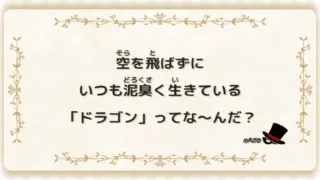“わに+わに”で産まれる「生き物」ってな~んだ? | むずかしい(大人レベル)- 挑戦状 109 むずかしい(大人) X Facebook はてブ LINE コピー 2025.11.082025.11.09 なぞなぞ仮面むずかしい(大人(おとな)レベル)の挑戦状(ちょうせんじょう)だゾ! ヒントをみるおたすけロボ“わ2”が2つの「生(い)き物(もの)」のことだヨ! 答(こた)えをみるなぞなぞ仮面正解(せいかい)は「鷲(わし)」だゾ!わかったかな!?イラっと博士“わ2”が2つで“わ4”になるんじゃな! なぞなぞ仮面次(つぎ)の挑戦状(ちょうせんじょう)はこれだゾ!