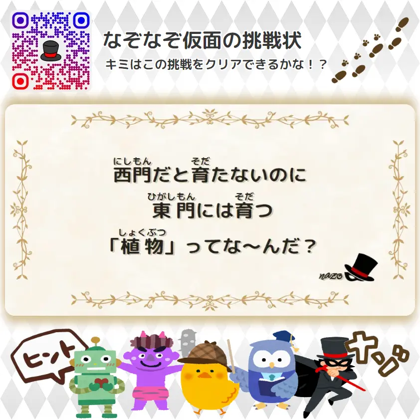 なんもん(鬼) 西門だと育たないのに、東門には育つ「植物」ってな~んだ? | なんもん(鬼レベル)- 挑戦状 067