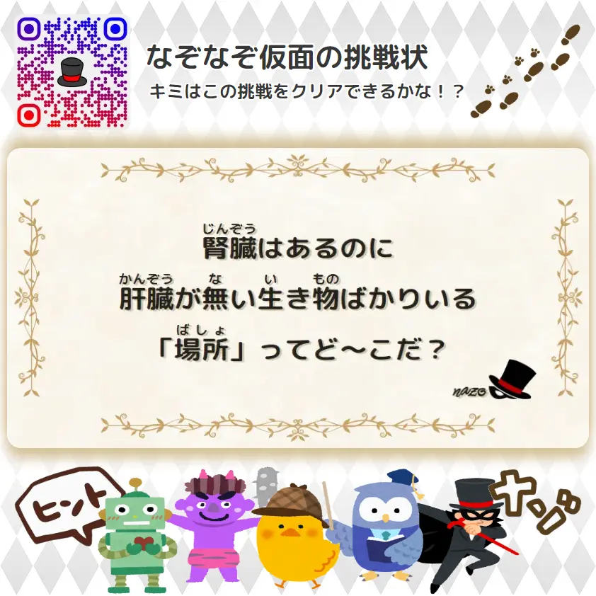 なんもん(鬼) 腎臓はあるのに、肝臓が無い生き物ばかりいる「場所」ってど~こだ? | なんもん(鬼レベル)- 挑戦状 068