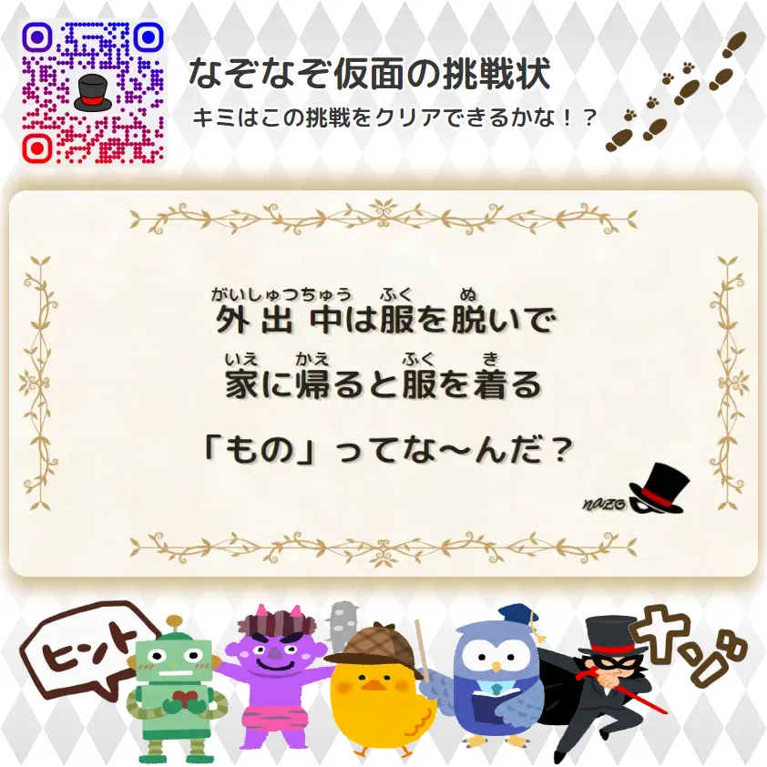 ふつう(中学生) 外出中は服を脱いで、家に帰ると服を着る「もの」ってな~んだ? | ふつう(中学生レベル)- 挑戦状 098