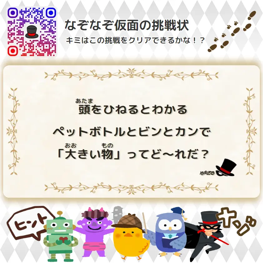 頭をひねるとわかる、ペットボトルとビンとカンで「大きい物」ってど~れだ? | なんもん(鬼レベル)- 挑戦状 055
