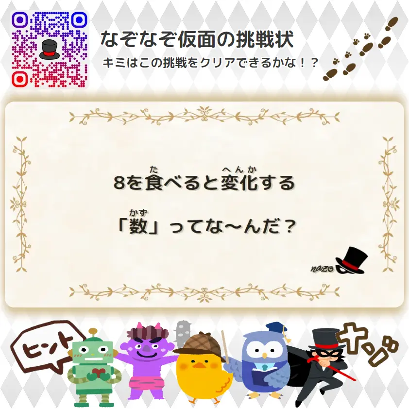 8を食べると変化する「数」ってな~んだ? | ふつう(中学生レベル)- 挑戦状 106