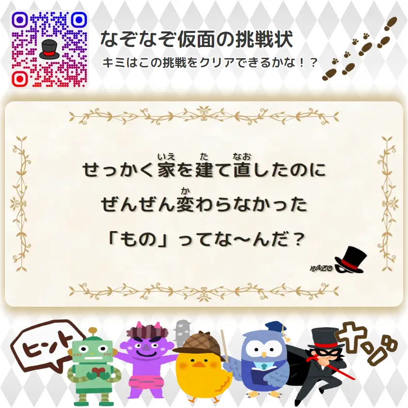 むずかしい(大人) せっかく家を建て直したのに、ぜんぜん変わらなかった「もの」ってな~んだ? | むずかしい(大人レベル)- 挑戦状 089